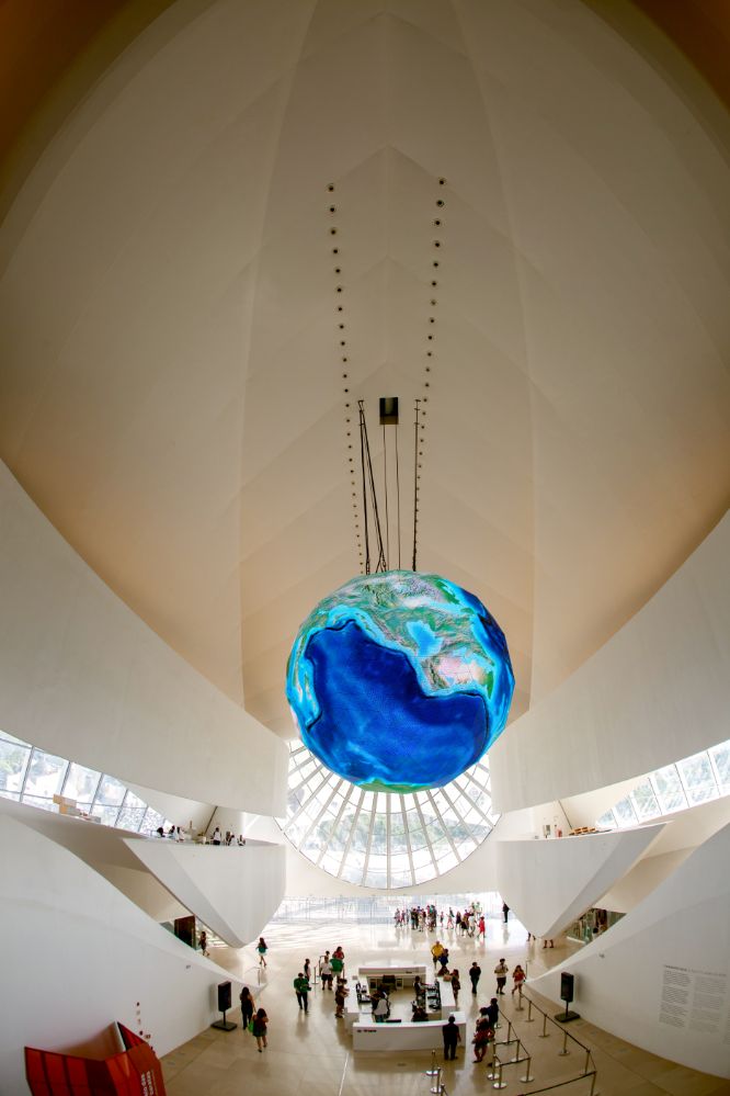 Sie werden die Installation mit doppelter Beschienung in den PVC-Profilleisten bemerken, sowie die zahlreichen eingearbeiteten Vorrichtungen für Strahler und die Aufhängung dieser beeindruckenden Weltkugel aus LED-Paneelen.